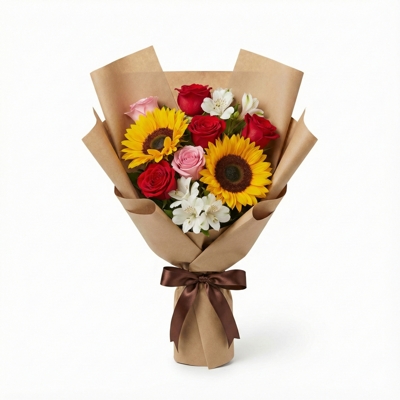 Buquê encantador composto por 2 girassóis radiantes, 5 rosas vermelhas, 1 rosa em tom rosa e 3 alstroemérias brancas, criando uma composição vibrante e cheia de vida. O contraste entre a energia dos girassóis, a intensidade das rosas vermelhas e a leveza das alstroemérias resulta em um arranjo marcante, equilibrado e naturalmente elegante. Ideal para celebrar momentos especiais com carinho, presença e um toque de alegria que se destaca à primeira vista.
