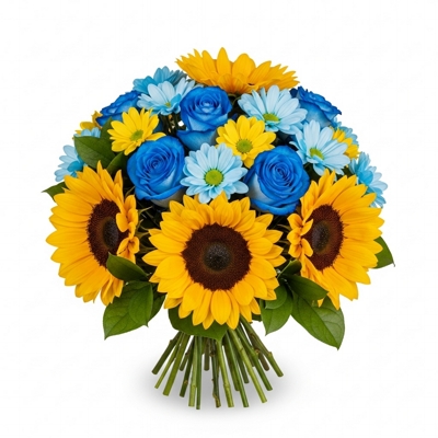 Um buque vibrante que combina o brilho dos girassóis com o encanto único das rosas azuis. Formando um visual equilibrado, moderno e cheio de personalidade. As folhas verdes naturais dão o toque final, deixando o buquê ainda mais elegante. Ideal para presentes marcantes, celebrações especiais ou para transformar qualquer ambiente com cor e energia.