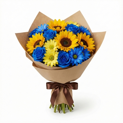 Um buque vibrante que combina o brilho dos girassóis com o encanto único das rosas azuis. Formando um visual equilibrado, moderno e cheio de personalidade. As folhas verdes naturais dão o toque final, deixando o buquê ainda mais elegante. Ideal para presentes marcantes, celebrações especiais ou para transformar qualquer ambiente com cor e energia.