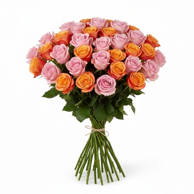 Buquê com rosas rosa e laranja em uma composição vibrante e cheia de charme. Suas cores intensas simbolizam carinho, alegria e afeto — perfeito para presentear ou decorar com elegância e um toque apaixonante em qualquer ocasião.