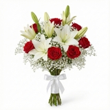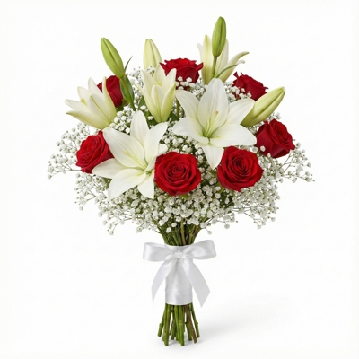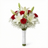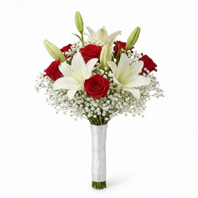 Buquê de noiva composto por 3 hastes de lírios brancos e 6 rosas vermelhas, complementado por 10 hastes de mosquitinho branco que suavizam a intensidade das cores e equilibram a composição. O arranjo tem presença elegante e proporções harmoniosas, unindo romantismo e sofisticação. Os caules são totalmente envolvidos por fita branca acetinada, garantindo um acabamento clássico, delicado e atemporal para o grande dia.