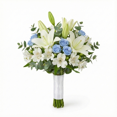 Buquê elegante composto por 3 hastes de lírios brancos, 6 alstroemérias brancas e 6 rosas spray em tom azul, complementado por 4 hastes de folhagem de eucalipto que acrescentam textura e frescor ao arranjo. A composição é equilibrada e sofisticada, transmitindo confiança, serenidade e harmonia. Perfeito para noivas que celebram uma união construída com calma, verdade e cumplicidade, com um visual leve e atemporal.