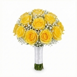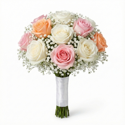 Buquê de noiva composto por 3 rosas brancas, 3 rosas em tom rosa suave e 3 rosas em tonalidade salmão pastel, combinadas com 5 hastes de mosquitinho branco que acrescentam leveza e movimento ao arranjo. A composição resulta em um visual romântico e equilibrado, com volume delicado e acabamento elegante. Os caules são cuidadosamente alinhados e totalmente envolvidos por fita branca acetinada, simbolizando compromisso, união e sofisticação no grande dia.