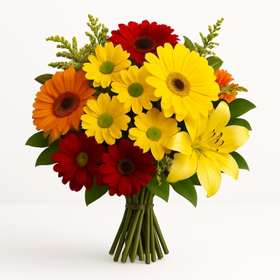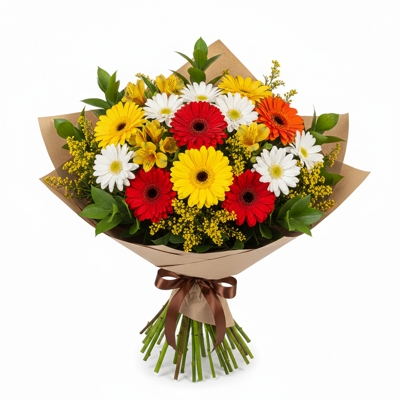 Buquê delicado em tons de rosa, lilás e branco, com gérberas, rosas, alstroemérias, margaridas e flores do campo. Uma combinação romântica e encantadora para celebrar momentos especiais com carinho.