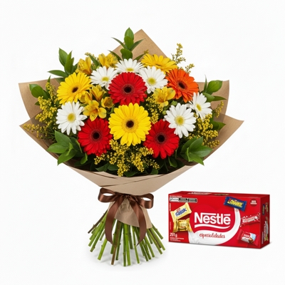 Buquê delicado em tons de rosa, lilás e branco, com gérberas, rosas, alstroemérias, margaridas e flores do campo. Uma combinação romântica e encantadora para celebrar momentos especiais com carinho.