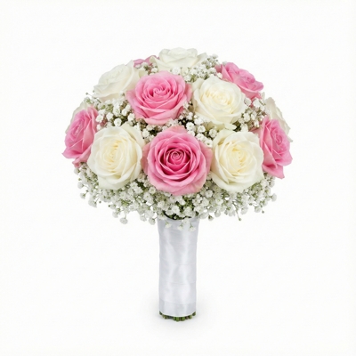 Buquê composto por 6 rosas pink e 6 rosas brancas, envolvidas por 10 hastes de mosquitinho branco que acrescentam leveza e suavidade ao conjunto. A composição é equilibrada e elegante, simbolizando amor verdadeiro, harmonia e compromisso. Ideal para noivas que celebram a promessa de um futuro construído a dois, com delicadeza, significado e beleza atemporal.