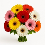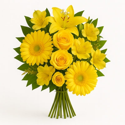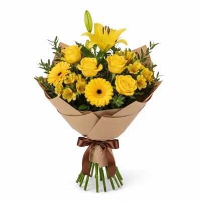 Buquê vibrante com lírios, gérberas, margaridas, astromélias, rosas amarelas e folhagens de tango e ruscus. Uma composição cheia de energia e elegância, ideal para transmitir alegria, frescor e iluminar qualquer ambiente com cores quentes e vivas.