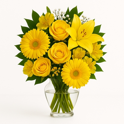 Arranjo vibrante com lírios, gérberas, margaridas, crisântemos e folhagens em tons de amarelo e verde, em elegante vaso. Uma explosão de cor e alegria para iluminar ambientes, surpreender alguém especial ou celebrar a vida com energia e sofisticação.