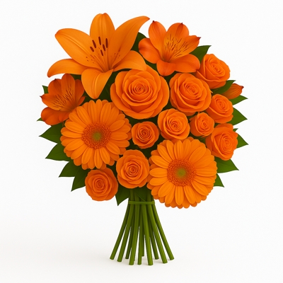 Arranjo vibrante com gérberas, lírios, alstroemérias, rosas e rosas spray em tons de laranja, acompanhados de folhagens de ruscus. Uma combinação cheia de frescor, ideal para iluminar ambientes ou presentear com charme e personalidade.