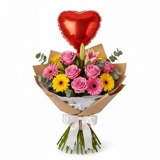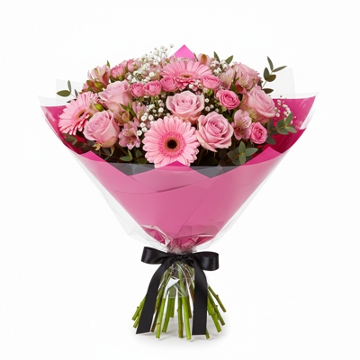 Buquê encantador composto por 3 alstroemérias rosas, 3 rosas em tom rosa, 2 gérberas rosas e 4 rosas spray Pink Blue, suavemente envolvidos por gipsofila e 2 hastes de folhagem de ruscus que dão leveza e estrutura ao arranjo. A composição é delicada, equilibrada e naturalmente romântica, ideal para presentear com sensibilidade e transformar qualquer ocasião em um momento especial.