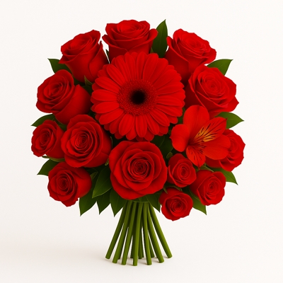 Buquê deslumbrante com gérberas, alstroemérias, rosas e rosas spray vermelhas, complementado com folhagens de ruscus. Um arranjo vibrante e elegante, ideal para expressar sentimentos profundos em ocasiões especiais.