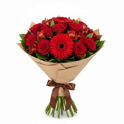 Buquê deslumbrante composto por 6 rosas vermelhas, 1 gérbera vermelha, 2 alstroemérias vermelhas e 3 rosas spray vermelhas, complementado por 4 hastes de folhagem de ruscus que trazem equilíbrio e estrutura ao arranjo. A composição é intensa, vibrante e elegante, ideal para expressar sentimentos profundos e marcantes em ocasiões especiais, sem perder a sofisticação.