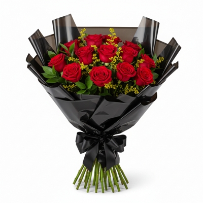 Buquê encantador com 12 rosas vermelhas, folhagem tango e ruscus. Uma composição delicada e cheia de significado, perfeita para demonstrar amor, carinho e surpreender em momentos especiais com romantismo e elegância.