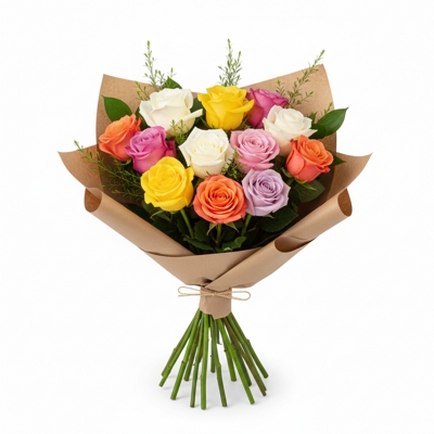 Buquê sofisticado com rosas em tons de laranja, branco, pink, amarelo, vermelho e rosa, combinadas com folhagens de ruscus e tango. Uma composição vibrante e harmoniosa que transmite sentimentos profundos com elegância e charme — ideal para presentear ou destacar ocasiões especiais.