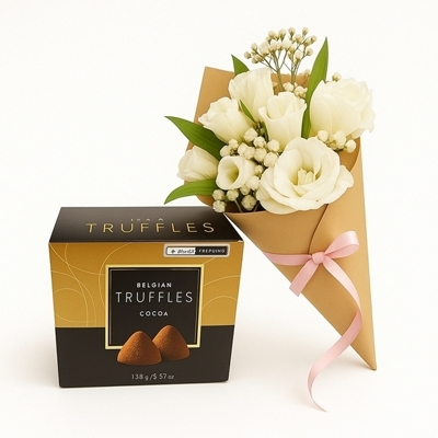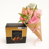 Surpreenda com este presente inesquecível: um delicado mini buquê de flores frescas acompanhado de trufas belgas finas e sofisticadas. Um mimo doce, elegante e cheio de amor.