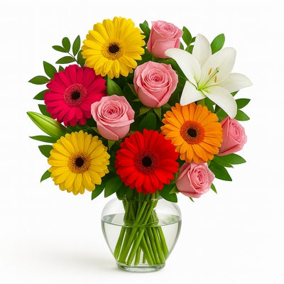 Um mix vibrante de gerberas multicoloridas, rosas delicadas e 2 lírios brancos em destaque, dispostos em um elegante vaso de vidro. Sofisticação, frescor e beleza em um presente inesquecível!