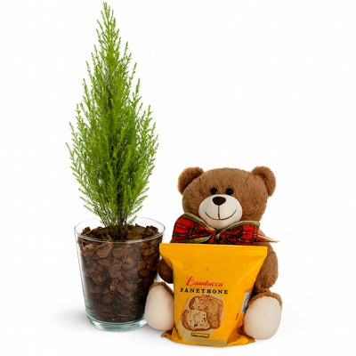 Arranjo natalino com tuia natural no vaso de vidro, mini panetone Bauducco e urso caramelo super fofo. Um presente acolhedor, delicado e cheio do clima de Natal, perfeito para decorar e adoçar a temporada com charme e simplicidade elegante.