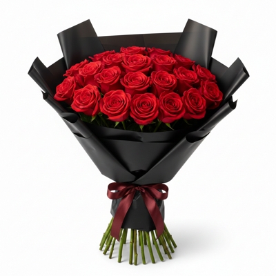 Buquê elegante com rosas vermelhas naturais, dispostas em composição densa e harmoniosa, criando impacto visual e sofisticação. Embalado em celofane preto metalizado e laço refinado, é um clássico atemporal para impressionar em qualquer ocasião especial.