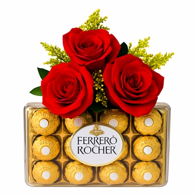 Buquê com 3 rosas vermelhas frescas, folhagem tango e caixa de bombons Ferrero Rocher. Uma combinação perfeita de amor, beleza e sabor — ideal para surpreender em datas especiais ou demonstrar carinho com sofisticação e emoção.