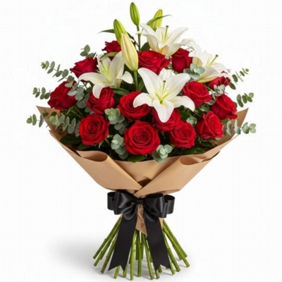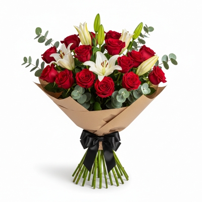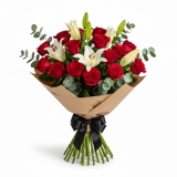 Composição imponente formada por 15 rosas vermelhas, 5 hastes de lírios e 10 hastes de folhagem de eucalipto, criando um equilíbrio preciso entre intensidade e elegância. As rosas trazem paixão e profundidade, os lírios adicionam sofisticação e presença, enquanto o eucalipto finaliza com frescor e leveza natural. Um arranjo marcante e refinado, ideal para expressar sentimentos fortes com classe, personalidade e impacto visual real.