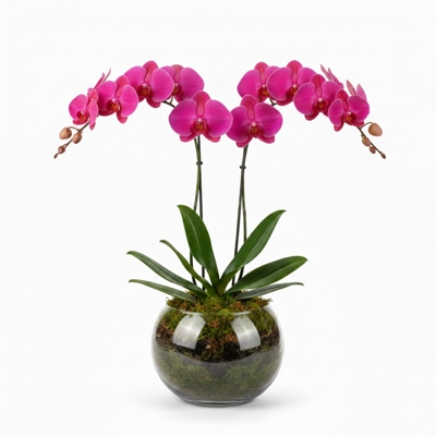 Orquídea Phalaenopsis pink em vaso de vidro tipo bowl, com musgo natural e acabamento sofisticado. Um arranjo elegante e atemporal, perfeito para presentear ou transformar qualquer ambiente com leveza, charme e um toque de exclusividade.