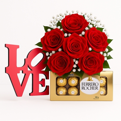 Buquê com 6 rosas vermelhas, gipsofila, folhagem ruscus, bombons Ferrero Rocher e quadro decorativo Love. Uma composição sofisticada que une romantismo, sabor e sentimento — perfeita para surpreender em aniversários, pedidos de namoro ou para expressar amor de forma inesquecível.